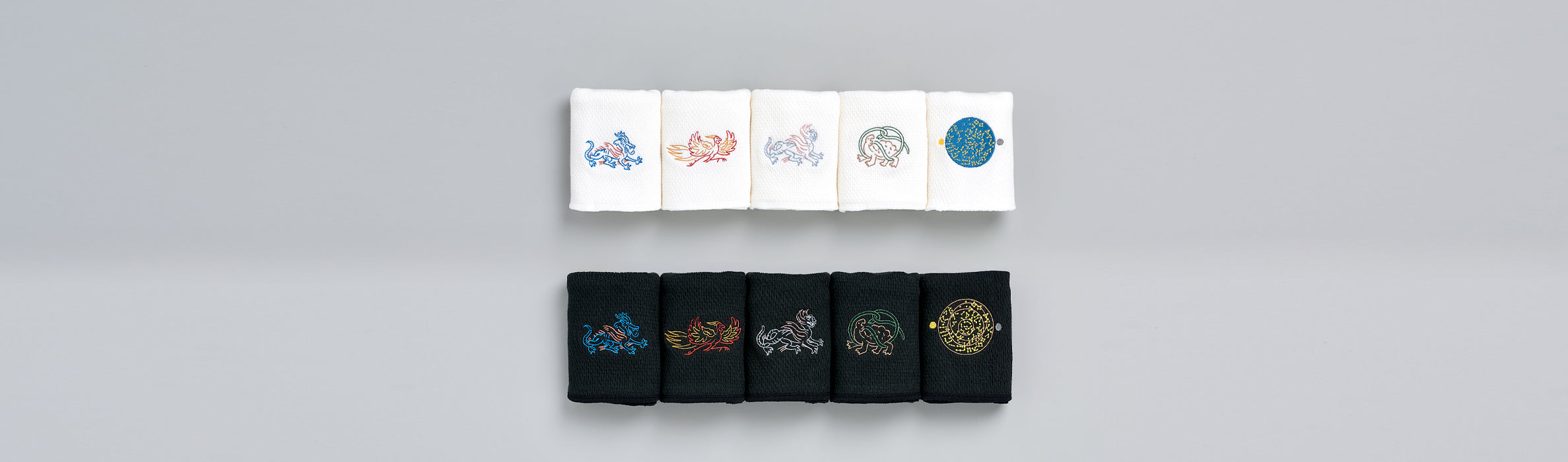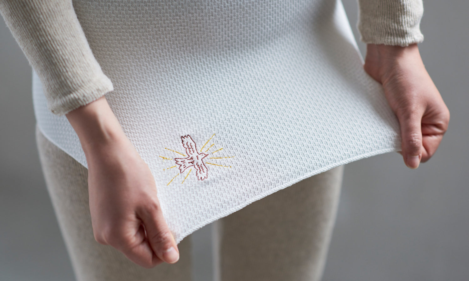 Chaque pièce est ornée d’une broderie porte-bonheur représentant un des symboles de la ville de Nara, ancienne capitale du Japon.
